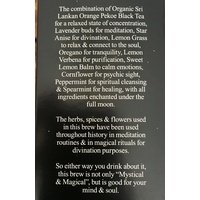 Rated 5/5 based on 2 reviews.Our Meditation - Lavender Infused organic black tea has clean aromas of flowers and mints which provide peace and tranquility with every sip. The combination of Organic Sri Lankan Orange Pekoe Black Tea for a relaxed state of concentration, Lavender Buds for meditation, Star Anise for divination, Lemon Grass to relax and connect to the soul, Oregano for tranquility, Lemon Verbena for purification, Sweet Lemon Balm to calm emotions, Cornflower for psychic sight, Peppermint for spiritual cleansing and Spearmint for healing, with all ingredients enchanted under the full moon. The herbs, spices and flowers used in this brew have been used throughout history in meditation routines and in magical rituals for divination purposes. So either way you drink about it, this brew is not only "Mystical & Magical", but is good for your mind & soul! Now with the conveniance of pyramid bags!